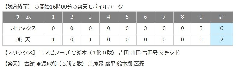 【楽天対オリックス21回戦】オリックスが6-2で楽天に逆転勝利し4連勝!3位・ロッテに5・5差!現役ドラフトで加入の鈴木が好救援で移籍後初勝利!楽天は3連敗