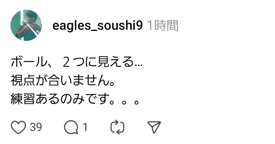 楽天・ドラ1吉野「ボール、2つに見える…。視点が合いません。練習あるのみです。。。」