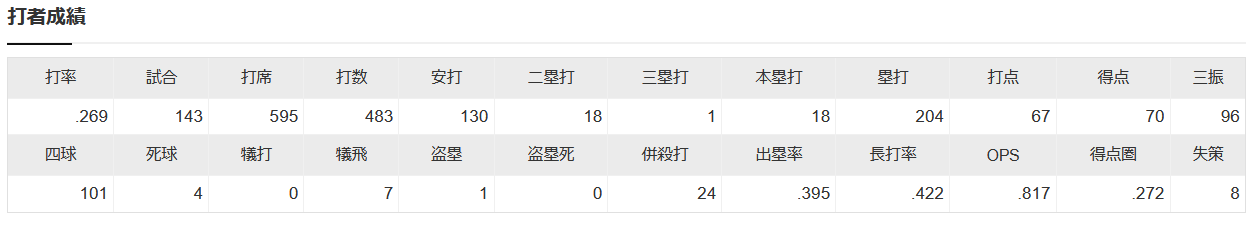 120試合.280(432-121) 32本 104打点 111三振 91四球 出塁率.408長打率.560 OPS.969