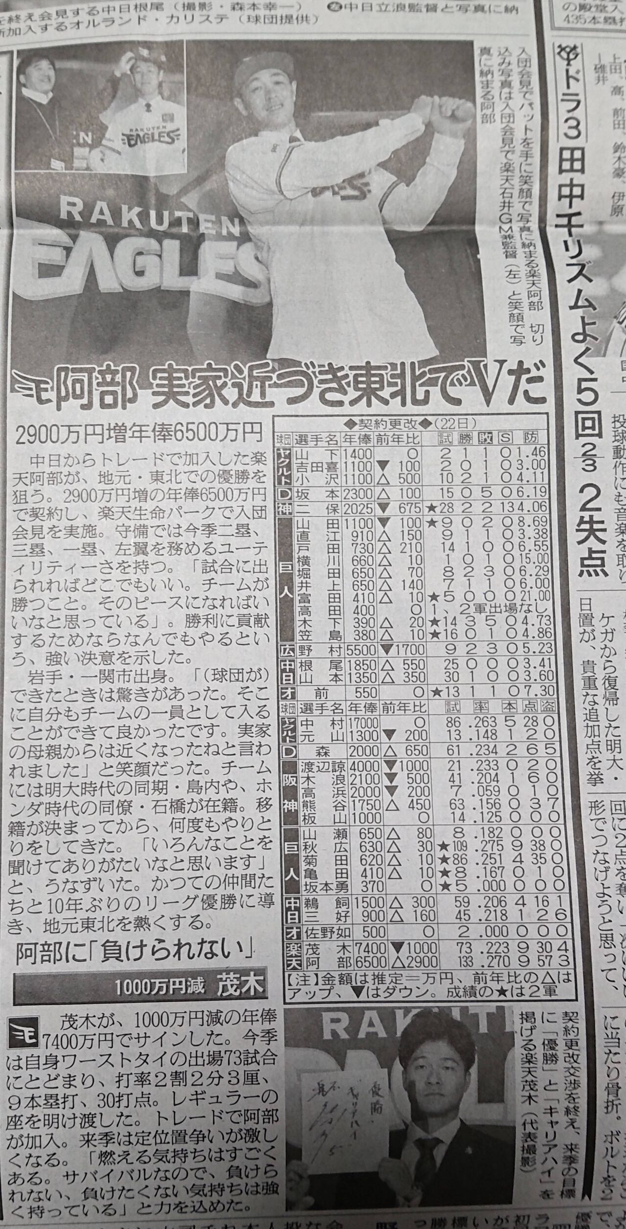 楽天阿部 2900万円増の6500万円で更改ww