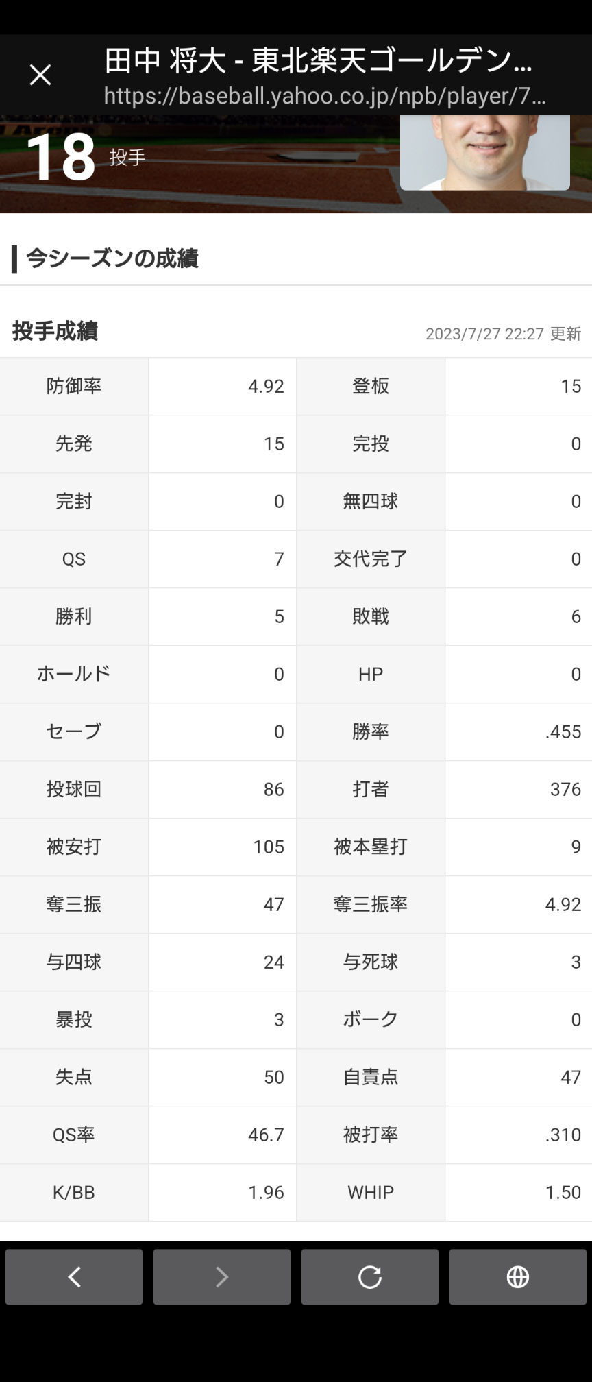 田中将大 5勝6敗 防御率4.92 奪三振率4.92 被打率.310 ←正直な感想